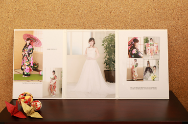 100カット以上撮影したフォトの中から、お気に入りのフォトを数枚選び、アルバムを作成いたします。アルバムの材質や色などを選び、世界に一つしかないアルバムを作成しましょう。